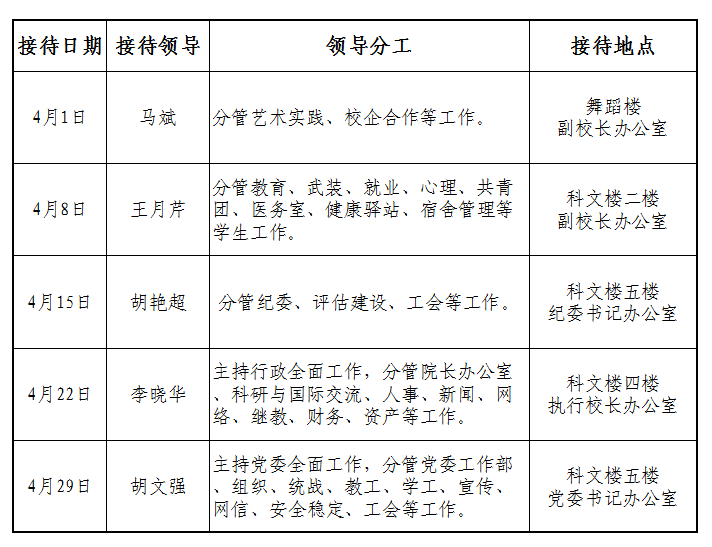 根据《天津传媒学院“校领导接待日”工作方案》规定及学校近期工作安排,现将2025年4月校领导接待师生来访安排通知如下: