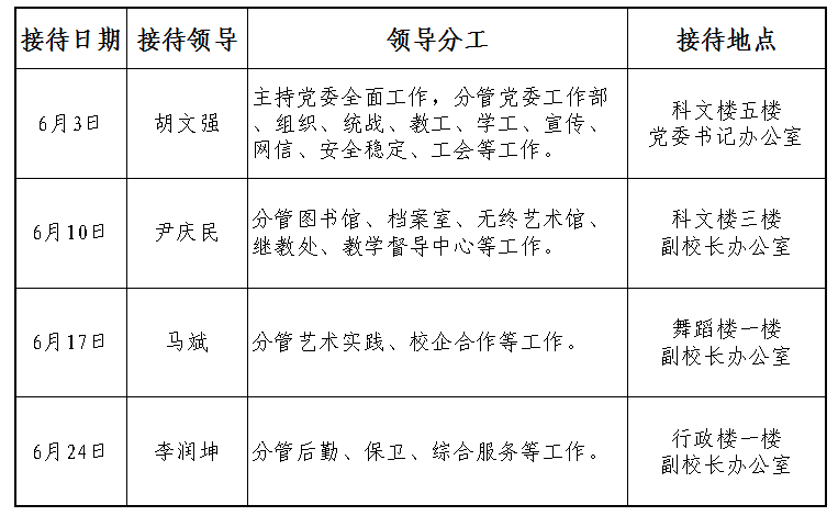 根据《天津传媒学院“校领导接待日”工作方案》规定及学校近期工作安排,现将2025年6月校领导接待师生来访安排通知如下:
