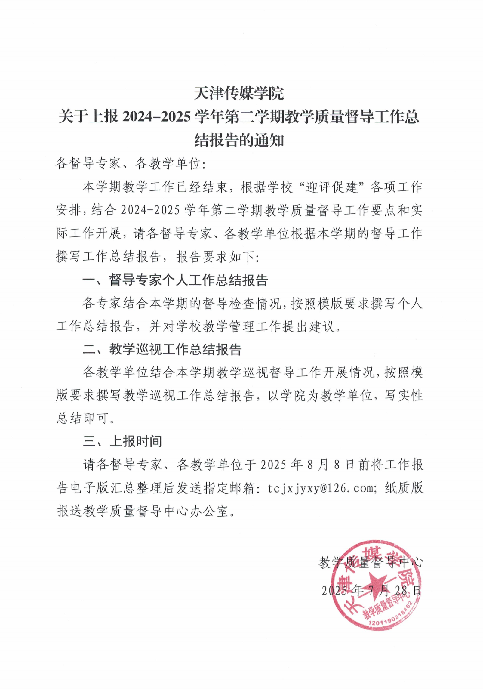 关于上报2024-2025学年第二学期教学质量督导工作总结报告的通知