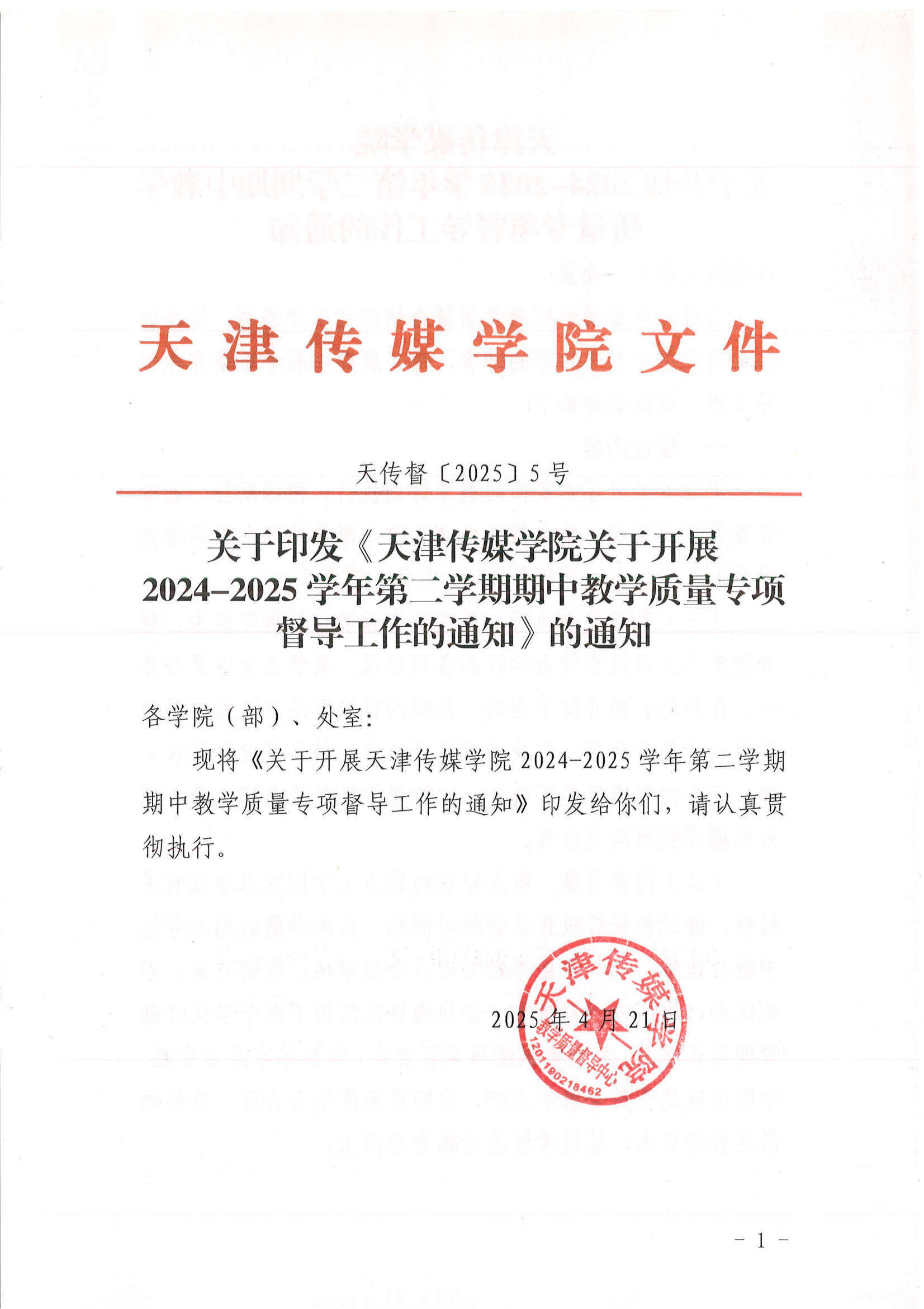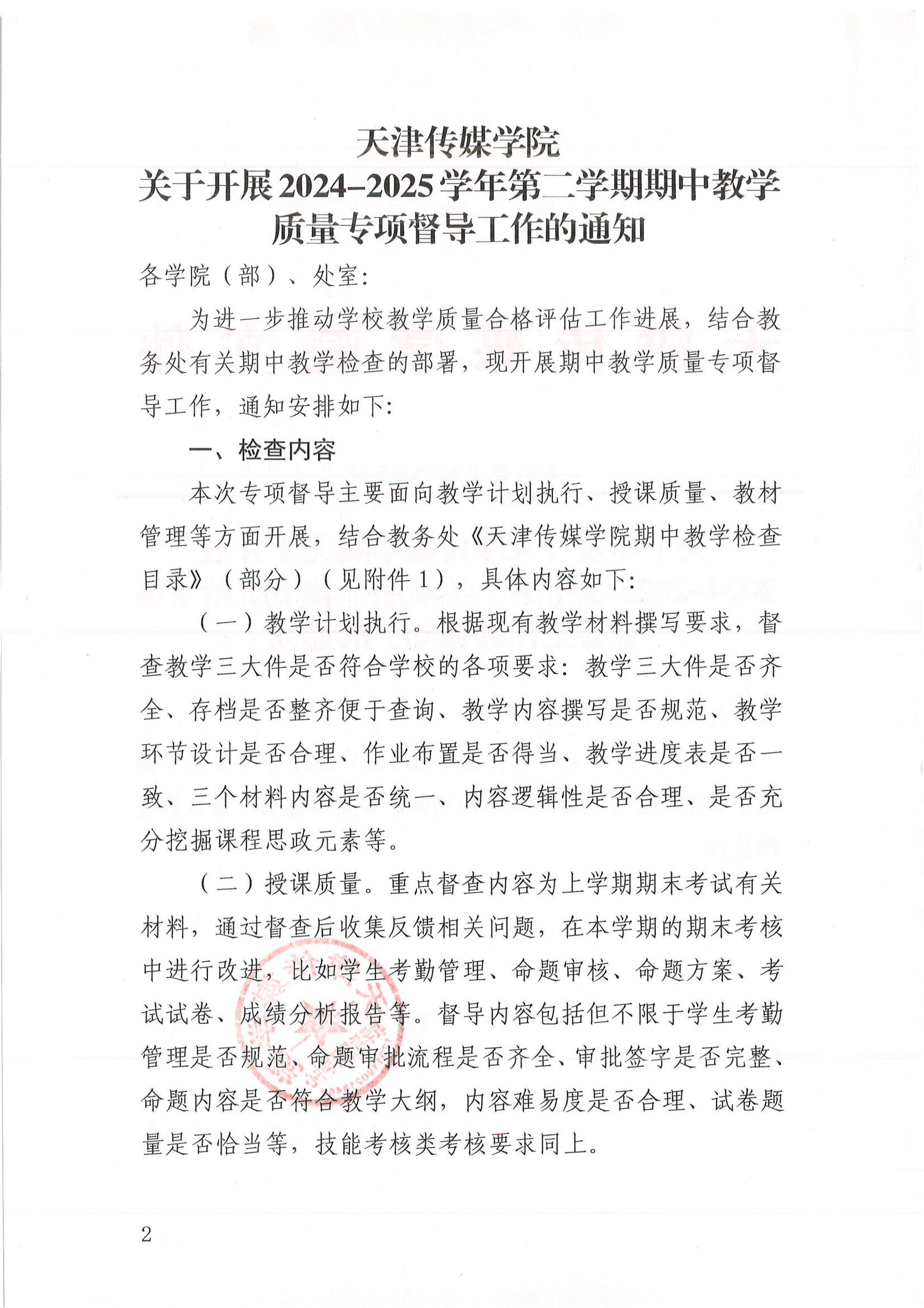 天津传媒学院关于开展2024-2025学年第二学期期中教学质量督导检查工作的通知