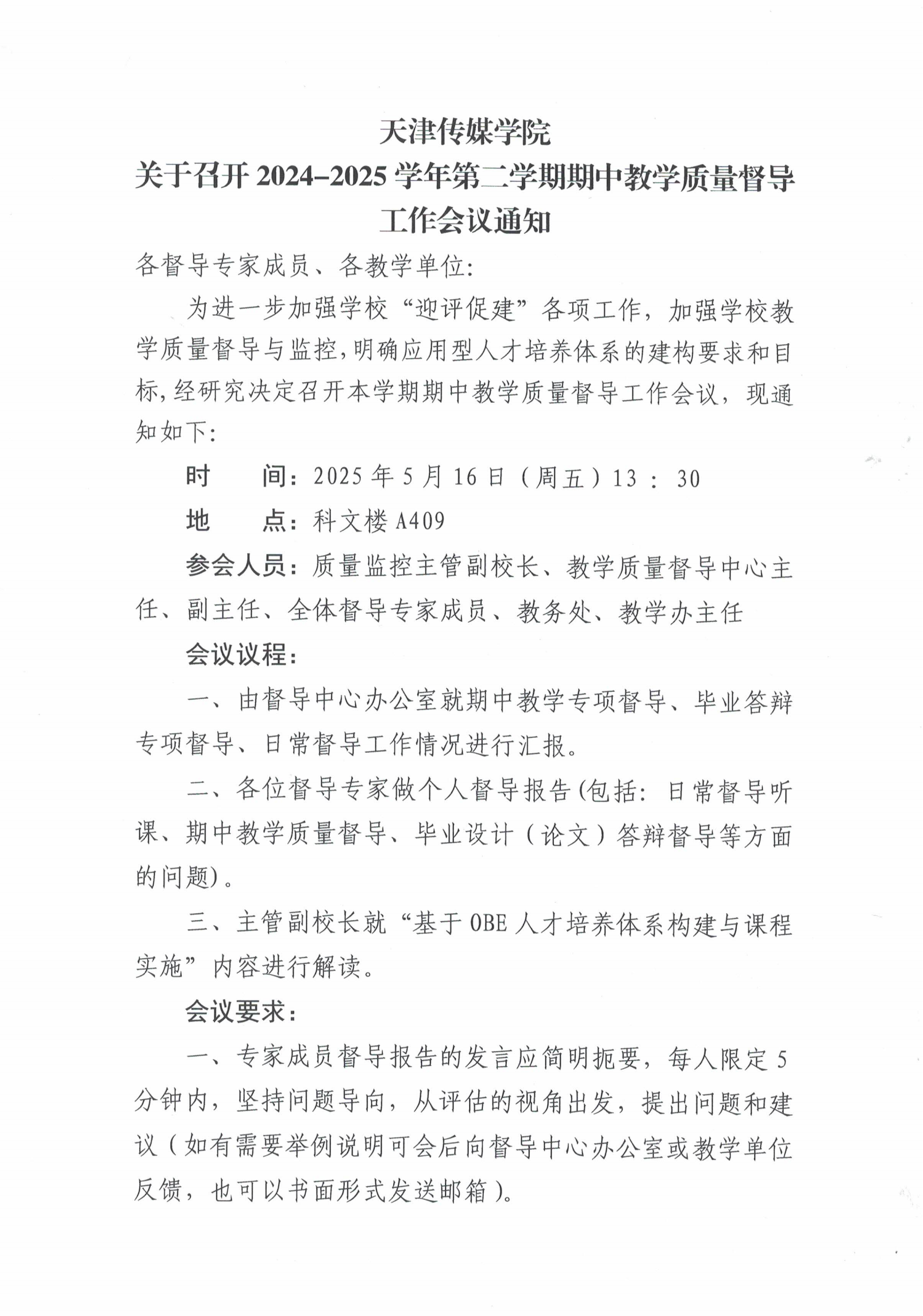 天津传媒学院关于召开2024-2025-2期中教学质量督导工作会议