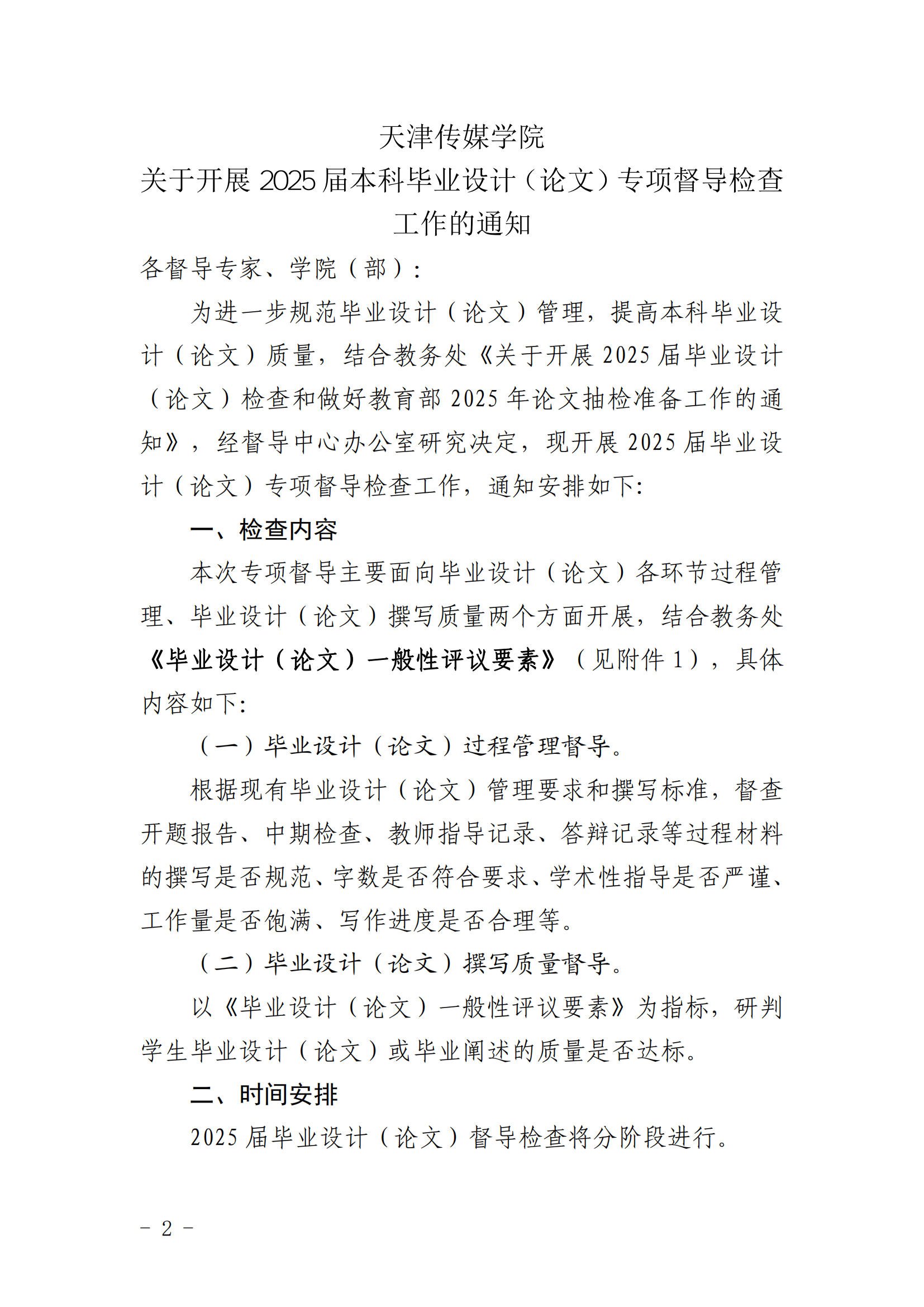 关于印发《天津传媒学院关于开展2025届本科毕业设计(论文)专项督导检查工作的通知》的通知(天传督【2025】8号