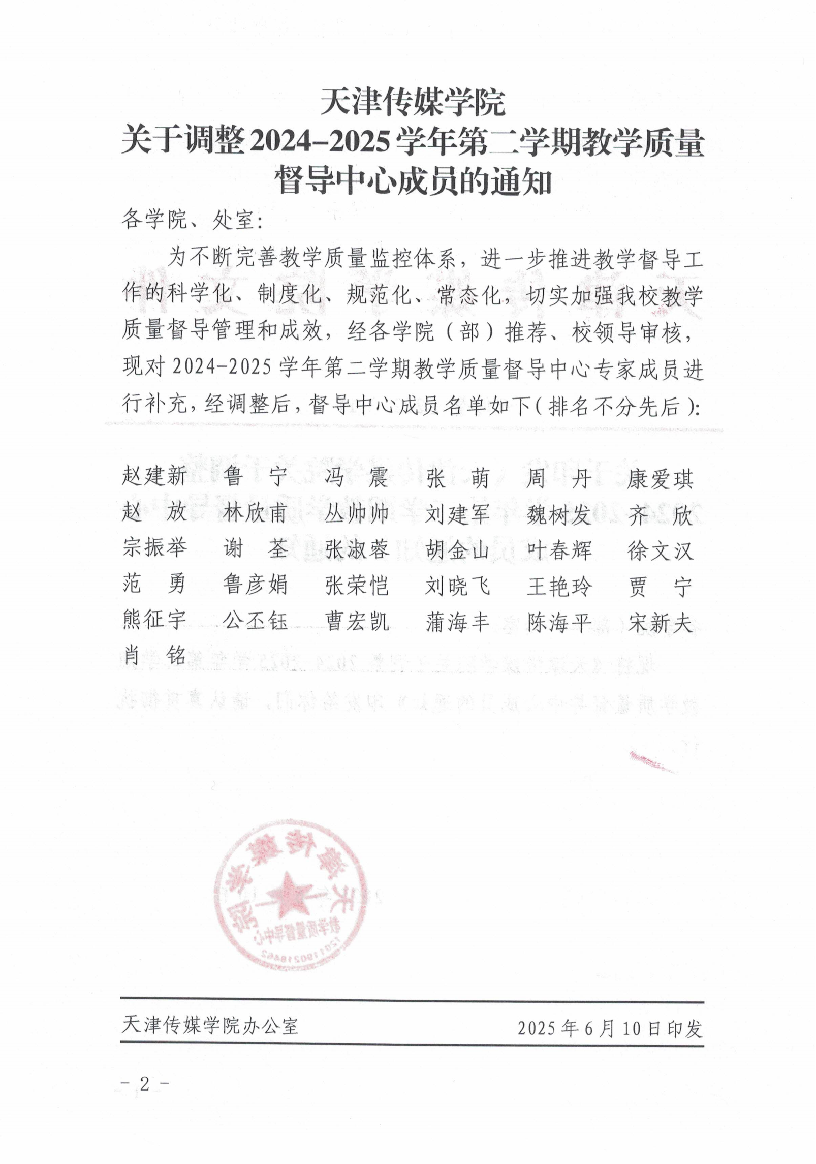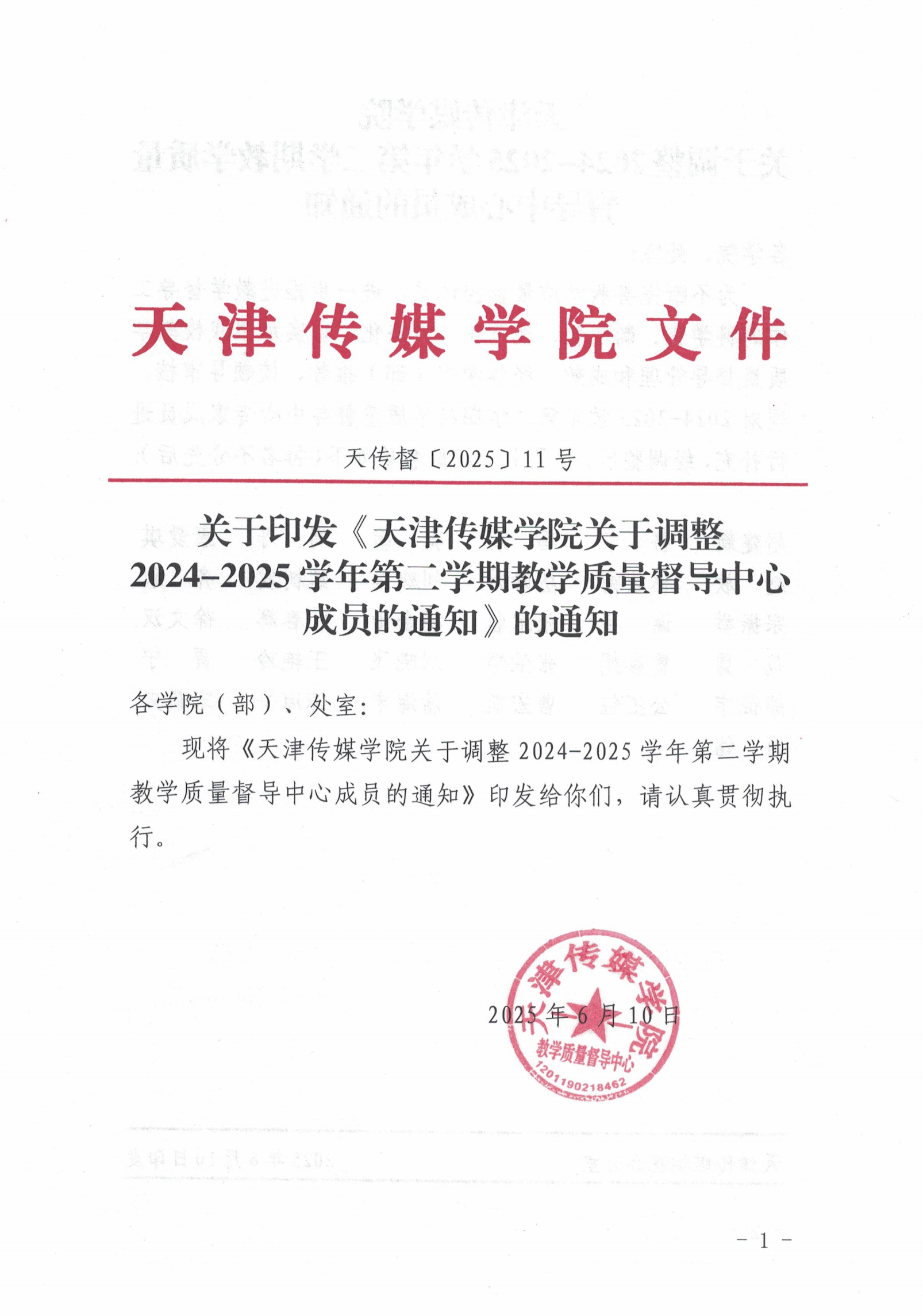 关于印发《天津传媒学院关于调整2024-2025学年第二学期教学质量督导中心成员的通知》的通知(天传督〔2025〕11 号)