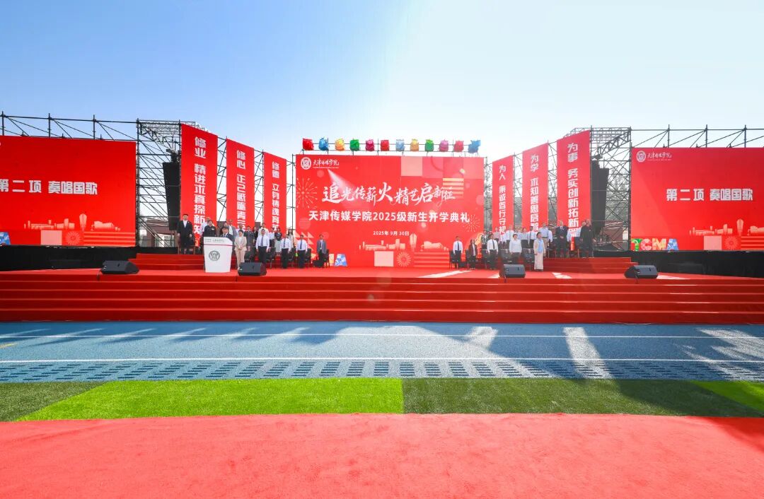 典礼现场,歌曲《追光的人》点燃全场热情,校旗随旋律缓缓展开,象征着新生正式融入天传大家庭。