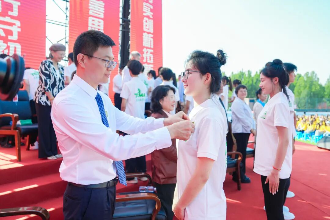 校徽授予仪式上,校领导与教授团亲手为新生佩戴校徽,“天传人”的身份与使命在此刻定格。
