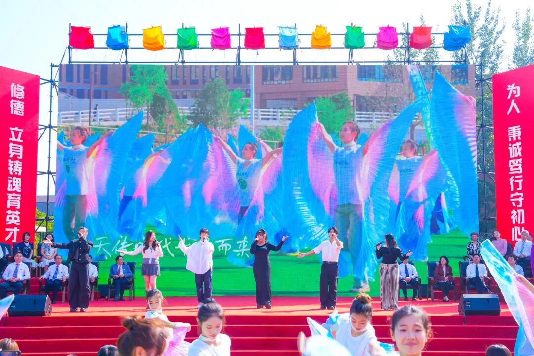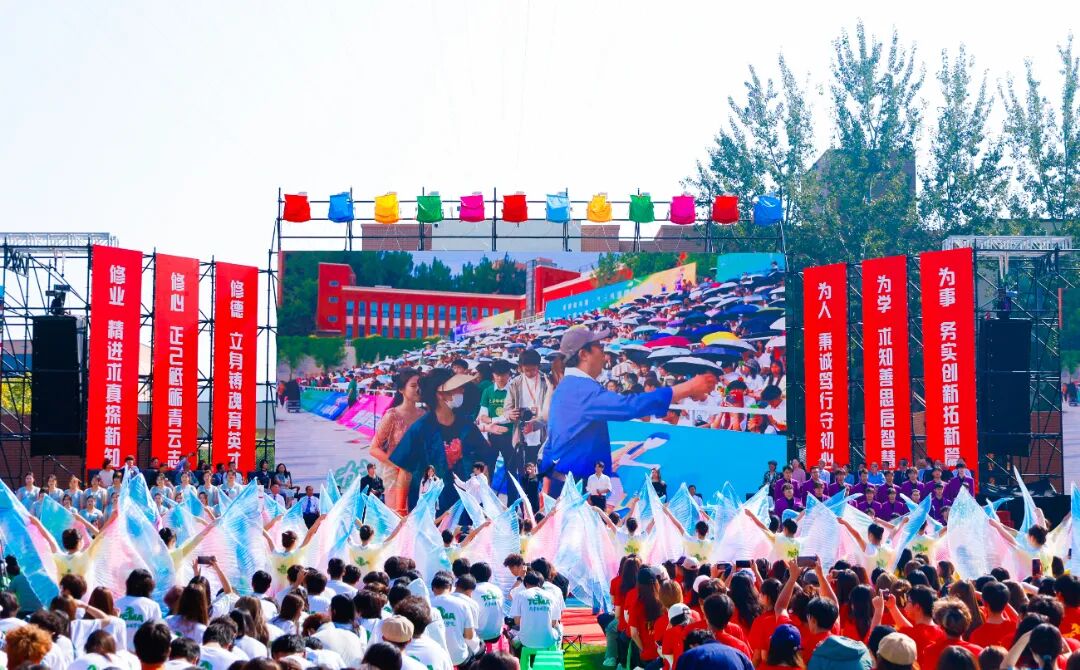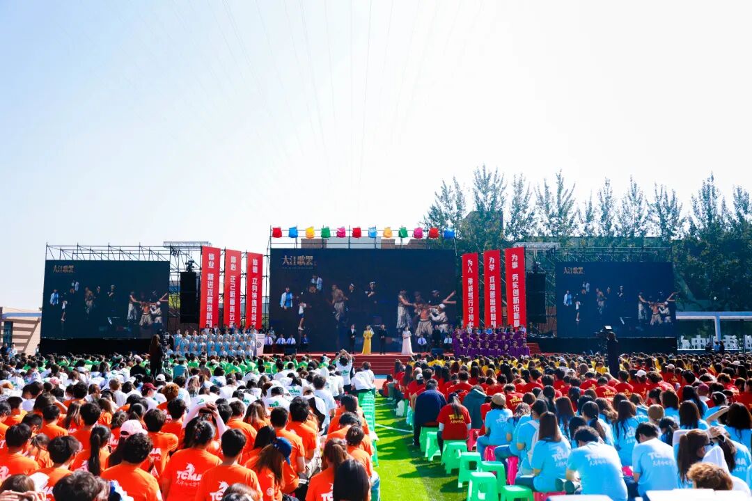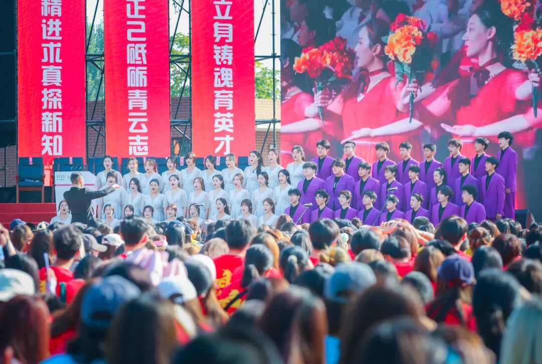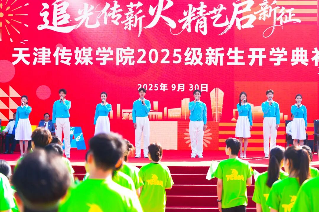 典礼现场,歌曲《追光的人》点燃全场热情,校旗随旋律缓缓展开,象征着新生正式融入天传大家庭。